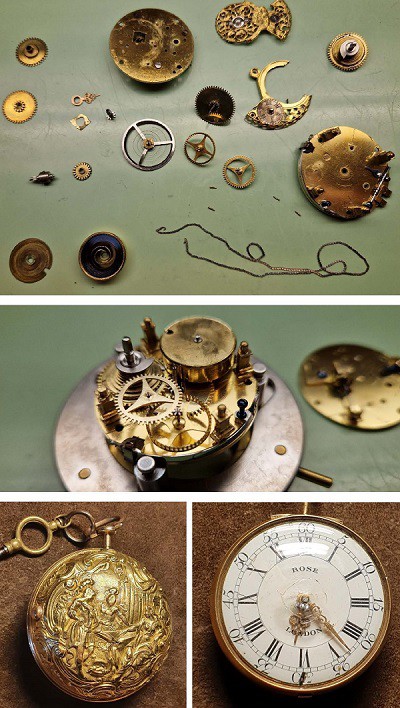 Die Spindelherrentaschenuhr mit Repousse'-Übergehäuse in 18 kt ist signiert „Joseph Rose & Sohn London Nr. 6942“, Engl. Halmark London 1762. Das Übergehäuse zeigt im Relief eine antike Szene. Weitere technische Daten: alte Zeiger in Form Louis XV., Emailleblatt, vergoldetes Platinenwerk mit Spindelhemmung, Diamantdeckstein, Viereckpilaster, Antrieb über Kette und Schnecke, Federvorspannung mit Wurmschraube, Spinerlkloben mit filigraner Durchbrucharbeit und Fratzengravur, silberne Regulierscheibe in Schmuckplatine eingelegt. Gewicht: ca. 100g (Gehäuse ca. 55g). Fotos: Holger Blumensath