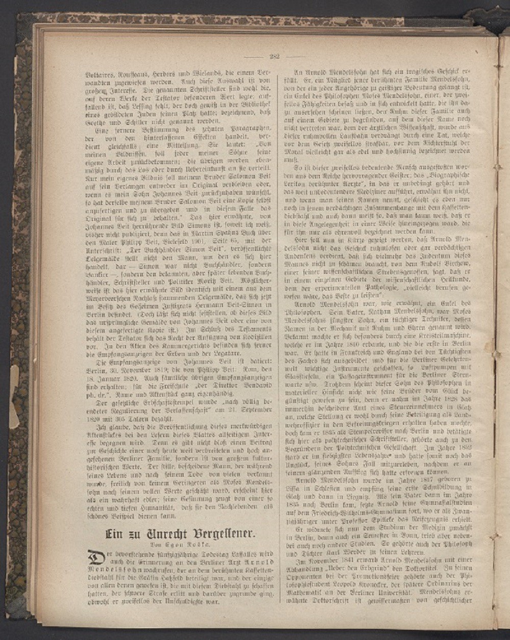 Hier soll nun in Kürze gezeigt werden, das Arnold Mendelssohn nicht das Geschick ruhmlosen oder gar verdächtigen Andenkens verdient, daß sich vielmehr das Judentum dieses Mannes nicht zu schämen braucht, von dem Rudolf Virchow einer seiner wissenschaftlichen Strebensgenossen, sagt, daß er in einem einzelnen Gebiete der wissenschaftlichen Heilkunde, dem der experimentellen Pathologie, „ vielleicht berufen gewesen wäre, das Beste zu leisten“.