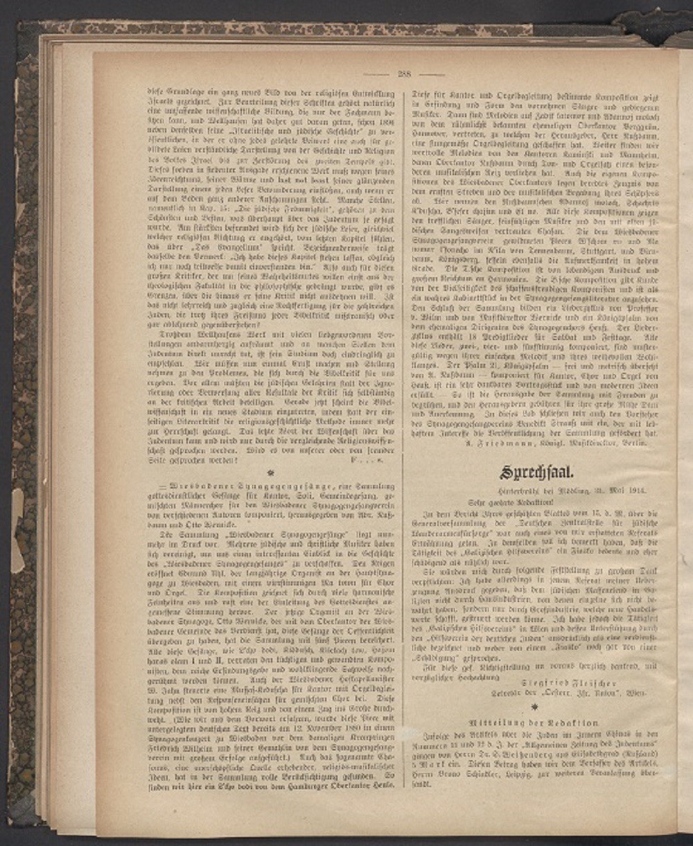 Diese für Kantor und Orgelbegleitung bestimmte Komposition zeigt in Erfindung und Form den vornehmen Sänger und gediegenen Musiker. Dann sind Melodien auf Zadik katomor und Adonnoj moloch von dem rühmlichst bekannten ehemaligen Oberkantor Berggrün, Hannover, vertreten, zu welchen der Herausgeber, Herr Nußbaum, eine sinngemäße Orgelbegleitung geschaffen hat. Weiter finden wir wertvolle Melodien von den Kantoren Kaminski und Mannheim, denen Oberkantor Nußbaum durch Ton- und Orgelsatz einen besonderen musikalischen Reiz verliehen hat. Auch die eigenen Kompositionen des Wiebadener Oberkantors legen beredtes Zeugnis von dem ernsten Streben und der musikalischen Begabung ihres Schöpfers ab. Wir nennen den Nußbaumschen Adonnoj moloch, Schachris K‘duscha, B‘sefer chajim und El no. Alle diese Kompositionen zeigen den trefflichen Sänger, feinfühligen Musiker und den mit alten jüdischen Sangesweisen vertrauten Chasan. Die dem Wiesbadener Synagogengesangsverein gewidmeten Piecen W‘schom ru und Ma nomar l‘fonecho im N‘ila von Tennenbaum, Stuttgart, und Birnbaum, Königsberg, fesseln ebenfalls die Aufmerksamkeit in hohem Grade. Die T.sche Komposition ist von lebendigem Ausdruck und großem Reichtum an Harmonien. Die B.sche Komposition gibt Kunde von der Vielseitigkeit des schaffensfreudigen Komponisten und ist als ein wahres Kabinettstück in der Synagogengesangsliteratur anzusehen. Den Schluß der Sammlung bilden ein Liederzyklus von Professor v. Wilm und von Musikdirektor Wernicke und ein Königspsalm von dem ehemaligen Dirigenten des Synagogenchors Heuß. Der Liederzyklus enthält 18 Predigtlieder für Sabbat und Festtage. Alle diese Lieder, zwei-, vier- und fünfstimmig komponiert, sind mustergültig wegen ihrer einfachen Melodik und ihres weihevollen Wohlklanges. Der Psalm 21, Königspsalm – frei und metrisch übersetzt von A. Nußbaum – komponiert für Kantor, Chor und Orgel von Heuß, ist ein sehr dankbares Vortragsstück und von modernen Ideen erfüllt.-- So ist die Herausgabe der Sammlung mit Freuden zu begrüßen, und den Herausgebern gebühren für ihre große Mühe Dank und Anerkennung. In dieses Lob schließen wir auch den Vorsteher des Synagogengesangsvereins Benedict Strauß mit ein, der mit lebhaftem Interesse die Veröffentlichung der Sammlung gefördert hat. A. Friedmann, Königl. Musikdirektor, Berlin.
