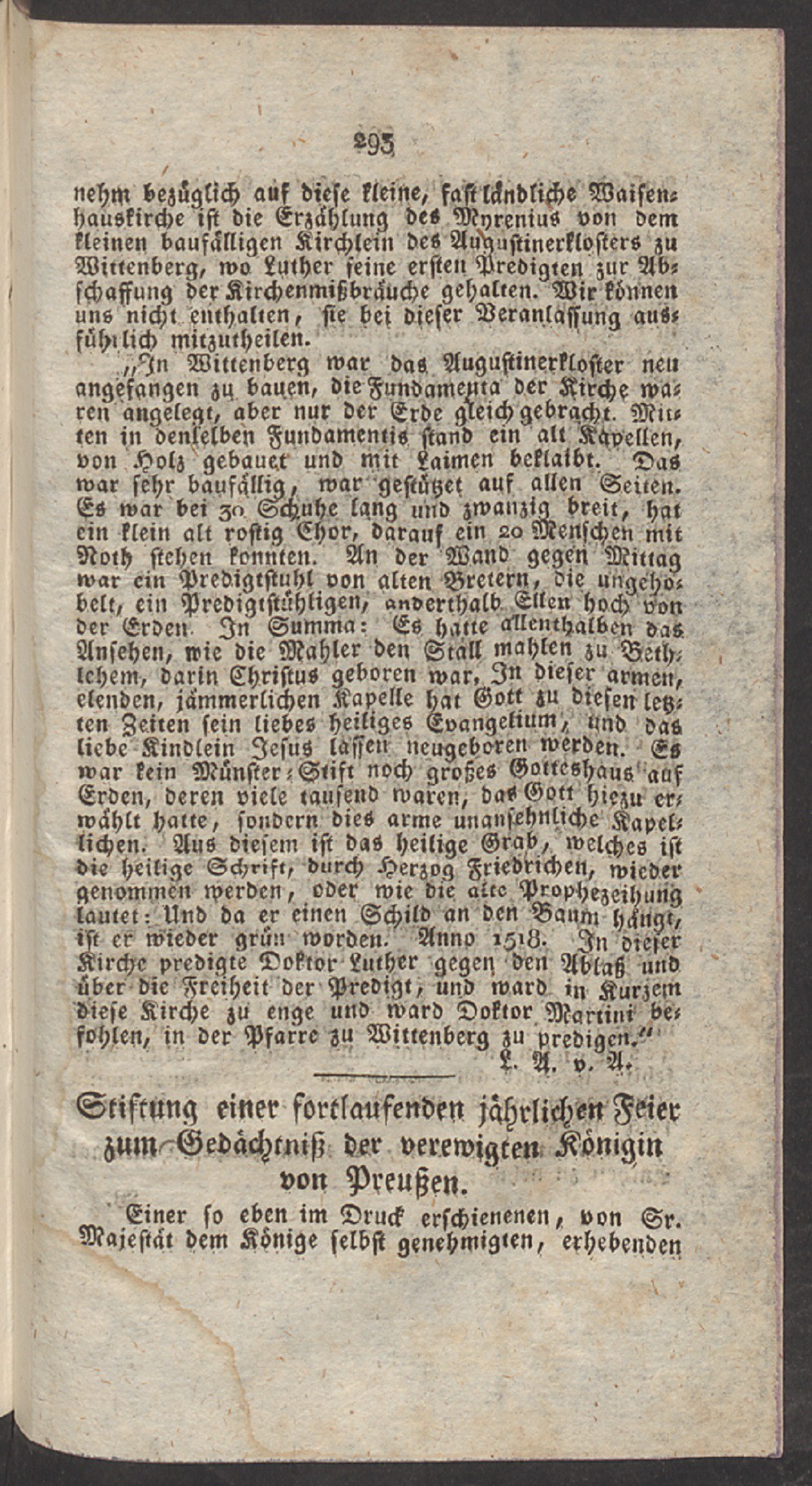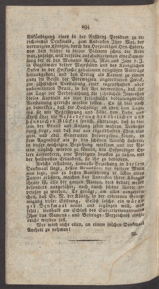 (294) ... Ankündigung eines in der Residenz Potsdam zu errichtenden Denkmals, zum Andenken Ihro Maj. der verewigten Königin, durch den Hofprediger Hrn. Eylert, von dem früher in diesen Blättern schon die Rede war, zufolge, will derselbe auf Subscription eine Sammlung der in den Monaten April, Mai und Juni d.J. in Gegenwart beider Majestäten und des Königlichen Hofes in der Hofkirche gehaltenen religiösen Vorträge herausgegeben; und dem Ertrag als Kapital zu einem ganz im Geiste der Verewigten angeordneten Zweck, zur jährlichen Ausstattung einer tugendhaften aber unbemittelten Braut, in der Art verwenden, daß ihr am Tage der Verheirathung die jährlichen Interessen dieses Kapitals als eine freundliche bedeutungsvolle Ausstattung gereicht werden sollen. Es ist hier noch zu bemerken, daß die Hochselige an eben dem Tage, wo sie mit Begeisterung und Fülle von Liebe und häuslichen Glückes sprach, überzeugt, daß in diesem der Grund und Anfang jeder wahren Verbesserung liege, und daß nur aus tugendhaften Ehen eine gute und adle Generation hervorgehen könne, in dem Augenblick, als sie den schönen Wunsch äußerte, in dieser wichtigen Beziehung wirksam und der Nation nützlich werden zu können, den Hofprediger Eylert aufforderte, jene Predigten drucken zu lassen, mit der huldvollen Erlaubniß, sie ihr zu dedicieren.