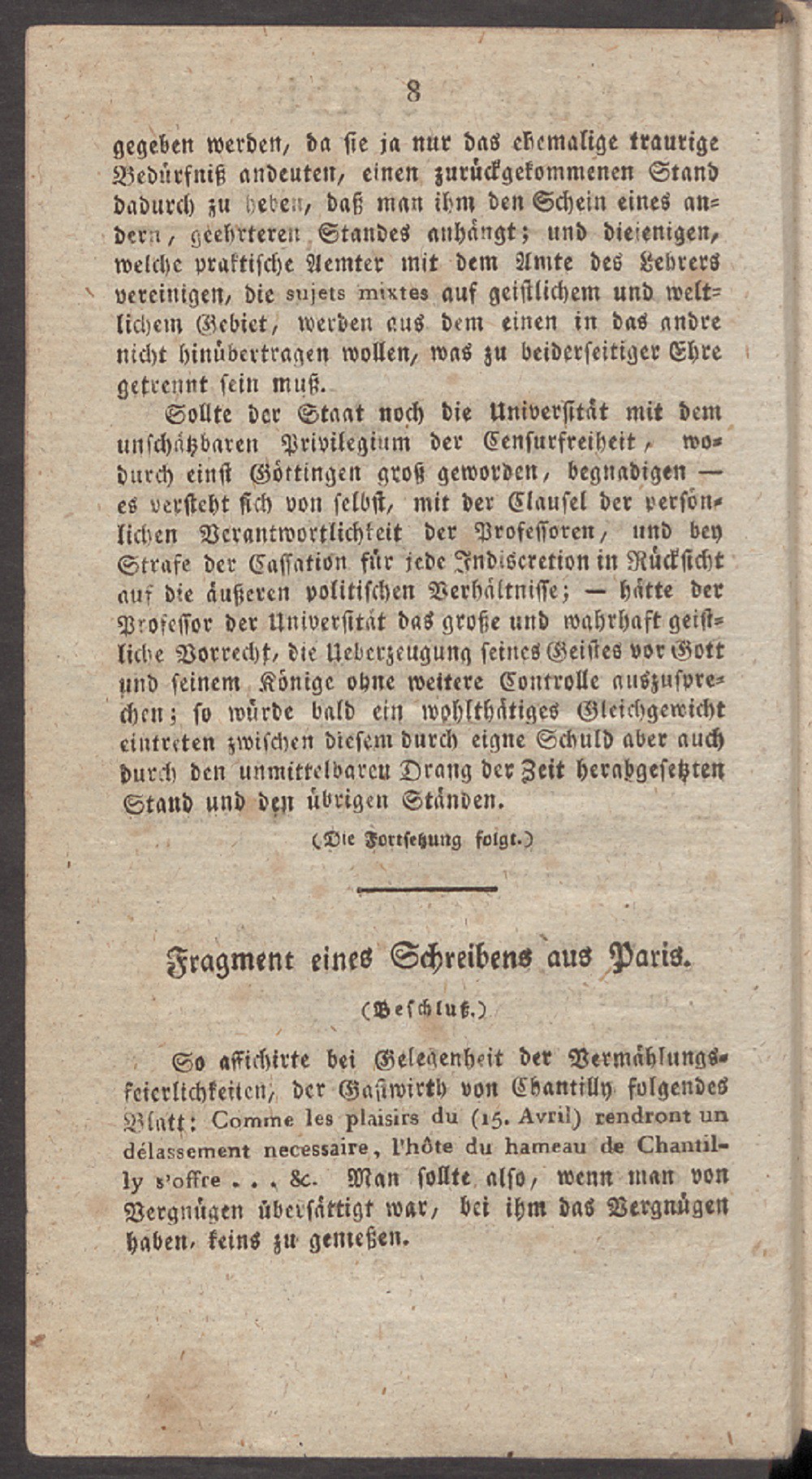 Sollte der Staat noch die Universität mit dem unschätzbaren Privilegium der Censurfreiheit, wodurch einst Göttingen groß geworden, begnadigen — es versteht sich von selbst, mit der Clausel der persönlichen Verantwortlichkeit der Professoren, und bey Strafe der Cassation für jede Indiscretion in Rücksicht