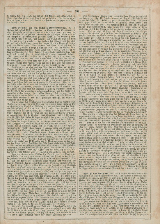 Und wie ihn der glänzende Sieg bei Möckern als Opfer forderte, so auch manchen von denen, die sich in jenen Tagen der Ruhe an einem Abend auf dem Rathskeller zusammenfanden, in feierlichem Commers mit Landesvater und durchstoßener Feldmütze das hallische Studententhum zu erneuern. – Was ist es doch mit dem deutschen Studententhum für ein eigenthümlich Ding; ein Afterbild des Mittelalters hat man es genannt, und jeder hat einmal darüber gelächelt. Aber wer es aus eigner Erfahrung kennt, denkt doch nur mit Freude und Rührung daran zurück, vor allen an die hohen Feste des Studententhums, an die Commerse. Man hat sich erhoben gefühlt dabei, wie bei einem heiligen Act, und die edelsten Gefühle wurden durch sie genährt oder erweckt. So der Eindruck, den eine solche Studentenfeier unter alltäglichen Verhältnissen macht – wie muß der Eindruck gewesen sein bei diesem Hallischen Commers, der wenig Tage vor dem entscheidenden gewaltigen Riesenkampfe bei Leipzig von alten Studenten abgehalten wurde, die jetzt für die Ehre und Freiheit des Vaterlandes, für die sie wohl schon vor Jahren an demselben Platze sich begeistert hatten, ausgezogen waren! Mit welcher Andacht mochte man singen, mit welcher Andacht die Feldmützen durchstoßen! – Neben den Studirten saßen aber auch die Nichtstudirten, saßen Stabsofficiere und Landwehrmänner neben einander recht im Sinne dieses preußischen Heeres, dieses deutschen Krieges. Mitten unter der Schaar saß der Oberst von Borcke, der erste Ritter vom eisernen Kreuze, saß der Major von Schack, der Adjutant York’s, „auch der alte General Horn hat dort sein Smollis gerufen und Graf von Brandenburg sein Fiducit geantwortet.“ – Die Todtenfeier Scharnhorst’s auf Schloß Wartenburg und dieser Commers unmittelbar vor der blutigen Entscheidung in Leipzigs Ebenen – welch herrliche Momente des heiligen Krieges!
