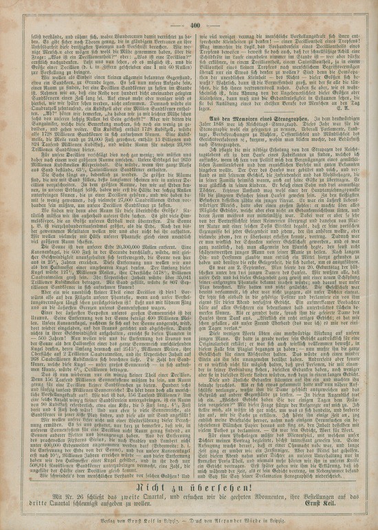 Wir wollen unsere Leser nicht mit einer Weiterführung dieser Berechnung ermüden. Es sei uns gestattet, nur kurz zu bemerken, daß wir, in unserem Sonnensystem für eine Decillion nicht Raum genug findend, an Sonnen anderer Welten uns hinangewagt haben. Aus der Entfernung des prachtvollen Fixsterns Sirius, die nach Bradley und Lambert nicht unter 400,000 Erdenweiten angenommen werden darf (Erdenweite: d. i. die Entfernung der Erde von der Sonne), und den unsere Kanonenkugel erst nach 101/2 Millionen Jahren erreichen würde – aus dieser Entfernung haben wir den Halbmesser einer Kugel gebildet, und in ihr doch nur 508,814 Nonillionen Sandkörner unterzubringen vermocht, eine Zahl, die ungefähr der Hälfte einer Decillion gleich kommt.