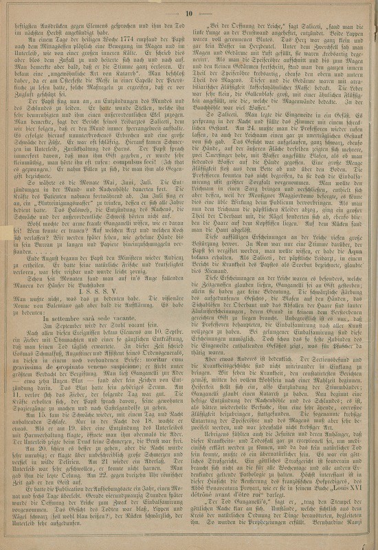 Aber etwas Anderes ist bedenklich. Der Sectionsbefund und die Krankheitsgeschichte sind nicht miteinander in Einklang zu bringen. Wir sehen die Krankheit, den constatirtesten Berichten gemäß, mitten bei vollem Wohlsein nach einer Mahlzeit beginnen. Heiserkeit stellt sich ein, also Entzündung der Stimmbänder; Ganganelli glaubt einen Katarrh zu haben. Nun beginnt eine heftige Entzündung der Rachenhöhle und des Schlundes; es ist, als hätten wiederholte Versuche, ihm eine sehr ätzende, corrosive Flüssigkeit beizubringen, stattgefunden. Die sogenannte krebsige Entartung der Speiseröhre und des Magens muß aber sehr bezweifelt werden, und war jedenfalls nicht krebsiger Art.