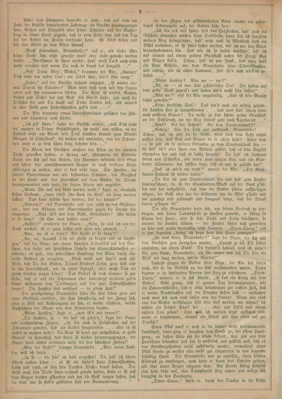 „Drum will ich’s auch zu Ende bringen,“ sagte Brunnhofer, wieder in den frühern Ton einlenkend. „Ich will’s nit leiden, daß mir der Bub zu guter Letzt’ Alles zernicht’, daß ich einmal vor meinem Bruder dasteh’n müßt wie ein Lugenbeutel … Ich will dem wilden Heinssen (Füllen) einen Zaum auflegen, der ihn bändigen kann! Gut thun muß er und geht’s an Gattern oder Zaun, – anders muß es werden, das sag’ ich und dabei bleib’ ich …“