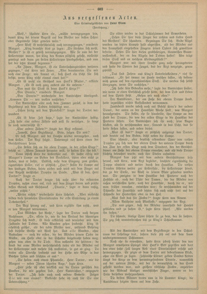 „Woher haben Sie diese rothbraunen Flecke?“ fragte der Amtsrichter den Gesellen, der ruhig und sogar mit einer gewissen höhnischen Heiterkeit den Bemühungen des Arztes gefolgt war.