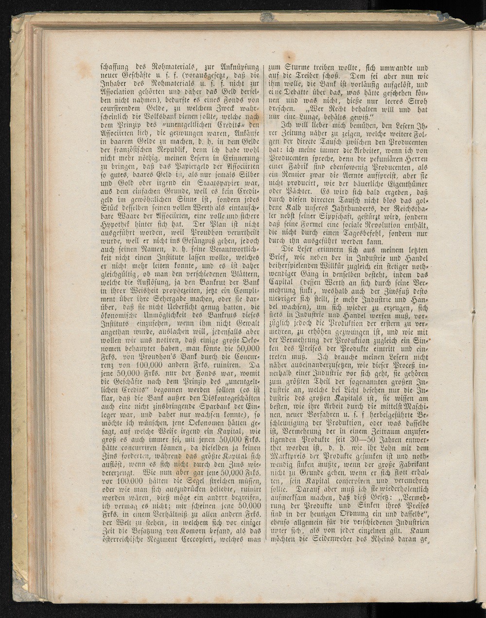 Der Plan ist nicht aufgeführt worden, weil Proudhon verurtheilt wurde, weil er nicht ins Gefängnis gehen, jedoch auch seinen Namen, d.h. seine Verantwortlichkeit nicht einem Institute lassen wollte, welches er nicht mehr leiten konnte, und es ist daher gleichgültig, ob man den verschiedenen Blättern, welche die Auflösung, ja den Bankruf der Bank in ihrer Weisheit prophezeiten, jetzt ein Compliment über ihre Sehergabe machen, oder sie darüber, daß sie nicht Übersicht genug hatten, ökonomische Unmöglichkeit des Bankrufs dieses Instituts einzusehen, wenn ihm nicht Gewalt angethan wurde, auslachen will, jedenfalls aber wollen wir uns notiren, daß einige große Oekonomen behauptet haben, man könnte die 50.000 Frks. Von Proudhon`s Bank durch die Concurenz von 100.000 andern Frks. ruiniren. Da jene 50.000 Frks. nur der Fonds war, womit die Geschäfte nach dem Prinzip des “ unentgeldlichen Credits“ begonnen werden sollten ( es ist klar, das die Bank außer den Diskontogeschäften auch eine nicht zinsbringende Sparbank der Einleger war, und daher nur wachsen konnte ), so möchte ich wünschen, jene Oekonomen hätten gesagt, auf welche Weise irgend ein Kapital, wie groß es auch immer sei, mit jenen 50.000 Frks. hätte concurriren können, da dieselben ja keinen Zins forderten, während das größte Kapital sich auflöst, wenn es sich nicht durch den Zins wiedererzeugt. Wie nun aber jene 50.000 Frks. vor 100.000 hätten die Segel streichen müssen, oder wie man sich auszudrücken beliebte, ruinirt worden wären, dies möge ein anderer begreifen, ich vermag es nicht; mir scheinen jene 50.000 Frks. in einem Verhältnis zu allen anderen Frks. der Welt zu stehen, in welchen sich vor einiger Zeit die Besatzung von Komorn befand, als das österreichische Regimen Geccopieri, welches man zum Sturme treiben wollte, sich umwandte und auf die Treiber schoß. Dem sei aber nun wie ihm wolle, die Bank ist vorläufig aufgelöst, und eine Debatte über das, was hätte geschehen können und was nicht, hieße nur leeres Stroh dreschen. „ Wer Recht behalten will und hat nur eine Lunge, behälts gewiß.“