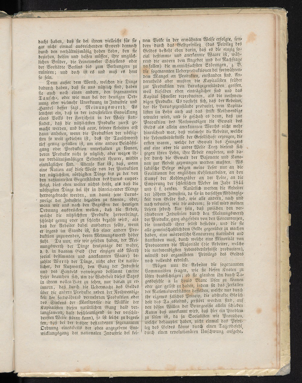 Ich will lieber mich bemühen, den Lesern Ihrer Zeitung näher zu zeigen, welche weitere Folgen der directe Tausch zwischen Producenten hat: ich meine immer die Arbeiter, wenn ich von Producenten spreche, denn die pekuniären Herren einer Fabrik sind ebensowenig Producenten, als ein Rentier zwar die Ernte aufspreist, aber sie nicht producirt, wie der bäuerliche Eigenthümer oder Pächter. Es wird sich bald ergeben, daß durch diesen dirceten Tausch nicht bloß das goldene Kalb unseres Jahrhunderts, der Reichsthaler nebst seiner Sippschaft, gestürzt wird, sondern daß seine Formel eine sociale Revolution enthält, die nicht durch einen Tagesbefehl, sondern nur durch ihn ausgeführt werden kann.