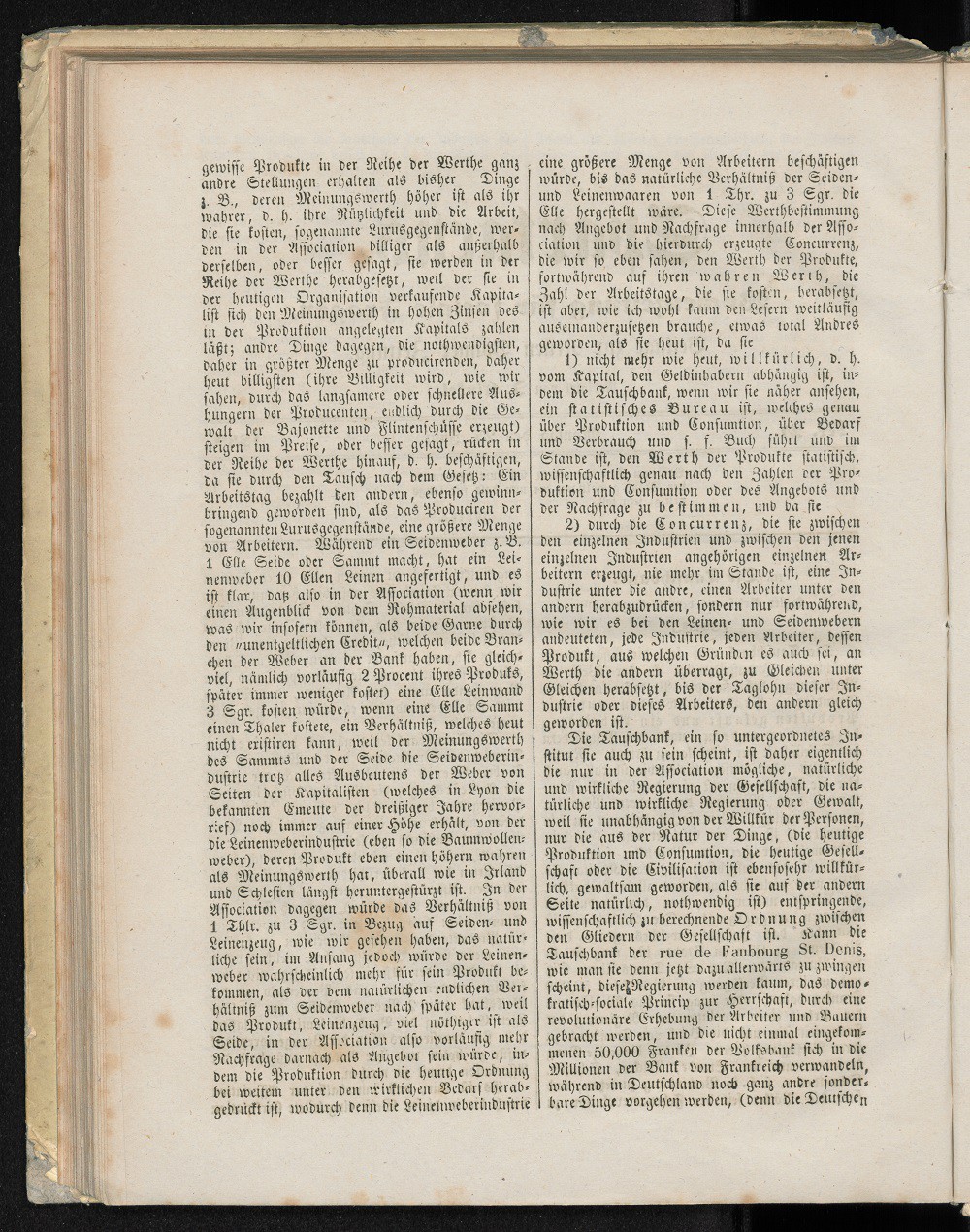 ... gewisse Produkte in der Reihe der Werthe ganz andere Stellungen erhalten als bisher. Dinge z.B. deren Meinungswerth höher ist als ihr wahrer, d.h. ihre Nützlichkeit und die Arbeit, die sie kosten, sogenannte Luxusgegenstände, werden in der Association billiger als außerhalb derselben, oder besser gesagt, sie werden in der Reihe der Werthe herabgesetzt, weil der sie in der heutigen Organisation verkaufende Kapitalist sich den Meinungswerth in hohen Zinsen des in der Produktion angelegten Kapitals zahlen läßt; andere Dinge dagegen, die nothwendigsten, daher in größter Menge zu producirenden, dem billigsten (ihre Billigkeit wird, wie wir sahen, durch das langsamere oder schnellere Aushungern der Producenten, endlich durch die Gewalt der Bajonette und Flintenschüsse erzeugt) steigen im Preise, oder besser gesagt, rücken in der Reihe der Werthe hinauf, d.h. beschäftigen, da sie durch den Tausch nach dem Gesetz: Ein Arbeitstag bezahlt den anderen, ebenso gewinnbringend geworden sind, als das Produciren der sogenannten Luxusgegenstände, eine größere Menge von Arbeitern. Während ein Seidenweber z.B. 1 Elle Seide oder Sammt macht, hat ein Leinenweber 10 Ellen Leinen angefertigt, und es ist klar, daß also in der Association (wenn wir einen Augenblick von dem Rohmaterial absehen, was wir insofern können, als beide Garne durch den „unentgeldlichen Credit“, welche beide Branchen der Weber an der Bank haben, sie gleichviel, nämlich vorläufig 2 Procent ihres Produkts, später immer weniger kostet) eine Elle Leinwand 3 Sgr. kosten würde, wenn eine Elle Sammt einen Thaler kostete, ein Verhältnis, welches heut nicht existiren kann, weil der Meinungswerth des Sammts und der Seide die Seidenweberindustrie trotz alles Ausbeutens der Weber von Seiten der Kapitalisten (welches in Lyon die bekannten Emente der dreißiger Jahre hervorrief) noch immer auf einer Höhe erhält, von der die Leinenweberindustrie (ebenso die Baumwollenweber), deren Produkt eben einen höheren wahren als Meinungswerth hat, überall wie in Irland und Schlesien längst heruntergestürzt ist. In der Association dagegen würde das Verhältnis von 1 Thlr. Zu 3 Sgr., in Bezug auf Seiden- und Leinenzeug, wie wir gesehen haben, das natürliche sein, im Anfang jedoch würde der Leinenweber wahrscheinlich mehr für sein Produkt bekommen, als der dem natürlichen endlichen Verhältnis zum Seidenweber nach später hat, weil das Produkt, Leinenzeug; viel nöthiger ist als Seide, in der Association also vorläufig mehr Nachfrage danach als Angebot sein würde, indem die Produktion durch die heutige Ordnung bei weiten unter dem wirklichen Bedarf herabgedrückt ist, wodurch denn die Leinenweberindustrie eine größere Menge von Arbeitern beschäftigen würde, bis das natürliche Verhältnis von Seiden- und Leinenwaren von 1 Thr. zu 3 Sgr. Die Elle hergestellt wäre. Diese Werthbestimmung nach Angebot und Nachfrage innerhalb der Association und die hierdurch erzeugte Concurrenz, die wir so eben sahen, den Werth der Produkte, die Zahl der Arbeitstage, die sie kosten, herabsetzt, ist aber, wie ich wohl kaum den Lesern weitläufig auseinanderzusetzen brauche, etwas total Anderes geworden, als sie heut ist, da sie