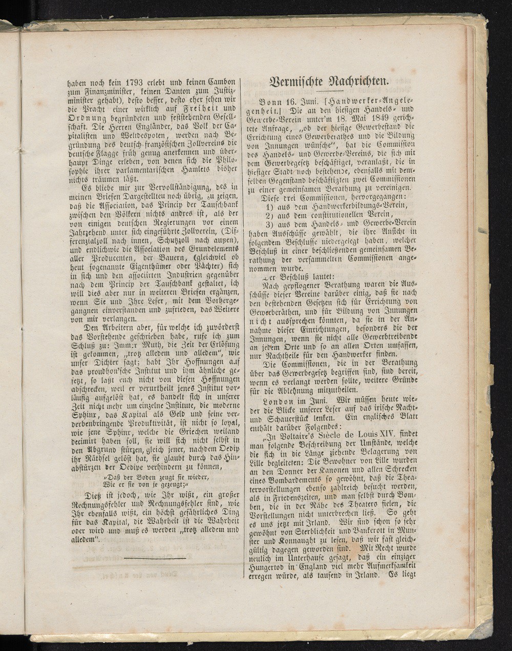 Bonn 16. Juni [Handwerker-Angelegenheit] Die an den hiesigen Handels – und Gewerbeverein unter´m 18. Mai 1849 gerichtete Anfrage, „ob der hiesige Gewerbestand die Errichtung eines Gewerberathes und die Bildung von Innungen wünscht“, hat die Commission des Handels- und Gewerbe-Vereins, die sich mit dem Gewerbegesetz beschäftigt, veranlaßt, die in dieser Stadt noch bestehende, ebenfalls mit demselben Gegenstand beschäftigen zwei Commissionen zu einer gemeinsamen Berathung zu vereinigen.