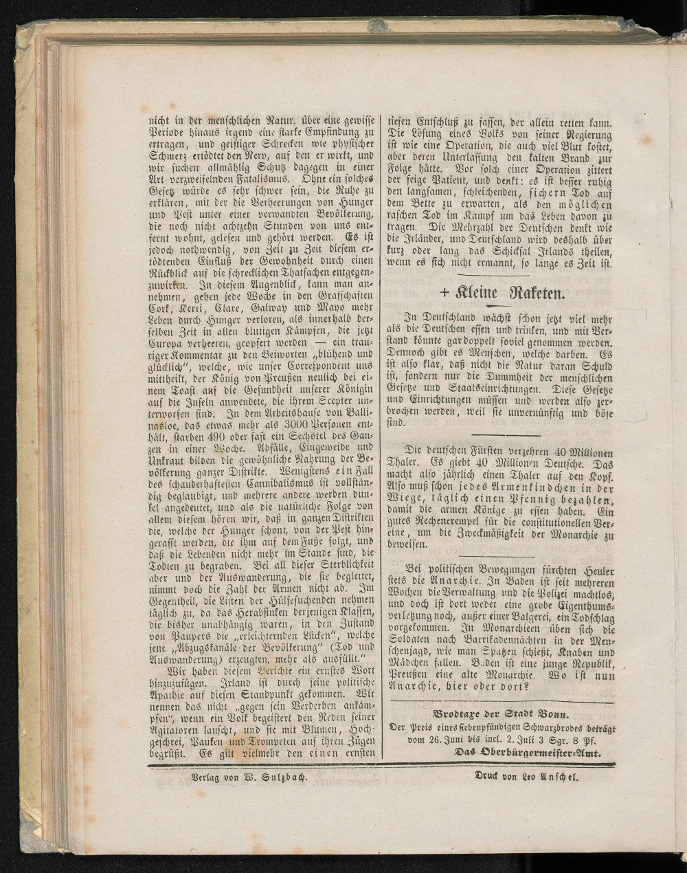 Der Preis eines siebenpfündigen Schwarzbrodes beträgt vom 26. Juni bis incl. 2. Juli