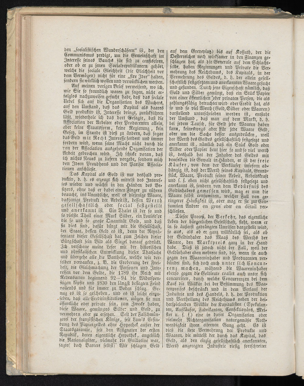 Auf meinen vorigen Brief verweisend, wo ich, wie Sie so freundlich waren zu sagen, nicht erfolglos nachzuweisen gesucht haben, daß das sociale Uebel sich auf die Organisation des Wuchers, auf den Umstand, daß das Kapital als baares Geld prodctiv ist, Interesse bringt, zurückführen läßt, wiederhole ich das dort Gesagte, daß die Association der Arbeiter oder Producenten allein, aber keine Staatsform, keie Regierung, kein Gesetz, im Stande ist dieß zu ändern, daß sogar das Geld mit Recht Interesse fordert und immer fordern wird, wenn seine Macht nicht durch die von der Association ausgehende Organisation der Arbeit gebrochen wird. Ich schicke voran, daß ich nichts Neues zu liefern vorgebe, sondern mich den Idden Proudhens und der Pariser Association anschließe.