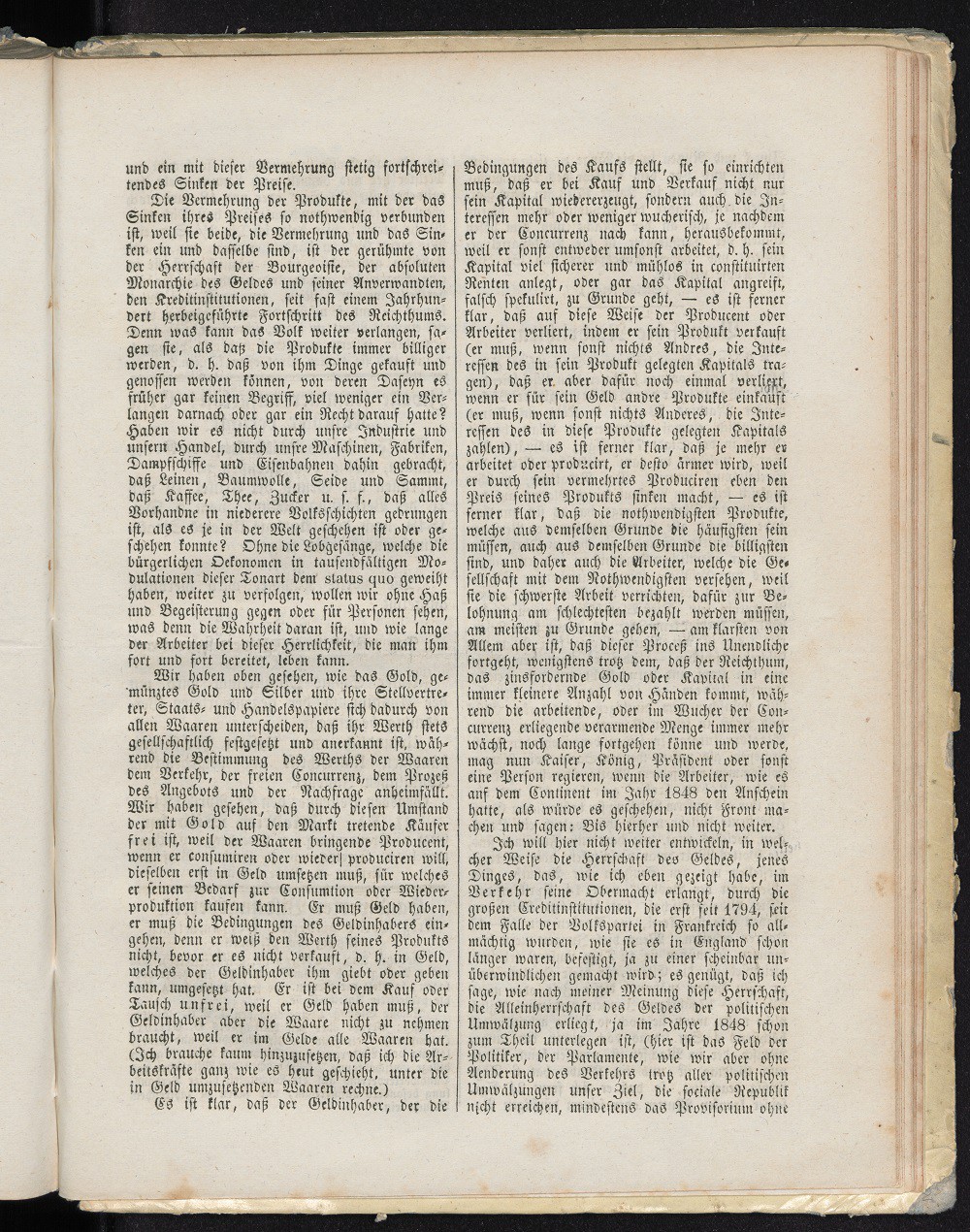 Ich will hier nicht weiter entwickeln, in welcher Weise die Herrschaft des Geldes, jenes Dinges, das, wie ich eben gezeigt habe, im Verkehr seine Obermacht erlangt, durch die großen Creditinstutitionen, die erst seid 1794, seit dem Falle der Volkspartei in Frankreich so allmächtig wurden, wie sie es in England schon länger waren, befestigt, ja zu einer scheinbar unüberwindlichen gemacht wird; es genügt, daß ich sage, wie nach meiner Meinung diese Herrschaft, die Alleinherrschaft des Geldes der politischen Umwälzung erliegt, ja im Jahre 1848 schon zum Theil unterlegen ist, (hier ist das Feld der Politiker, der Parlamente, wie wir aber ohne Änderung des Verkehrs trotz aller politischen Umwälzungen unser Ziel, die soziale Republik nicht erreichen, mindestens das Provisorium ohne ...