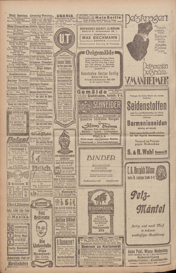 Die Erstaufführung der „Wildente“ im Theater in der Königgrätzer Straße ist auf den 7. November festgesetzt worden. Den alte Werle spielt Rudolf Lettinger, Gregers: Friedrich Kayßler, den alten Ekdal: Reinhold Schünzel, Hjalmar: Ludwig Hartau, Gina: Helene Fehdmer, Hedwig: Maria Orska, Frau Sörby: Olga Engl, Molvik: Richard Leopold. Die Regie führt Karl Meinhard.