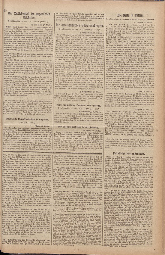 Italienischer Heeresbericht vom 26. Oktober: Die feindliche Offensive gegen den linken Flügel unserer Truppen an der Julischen Front, die durch mächtige Massen von Feinden genährt wurde, hielt in der Nacht zum 25. und den gestrigen Tag über mit äußerster Heftigkeit an. Vom Monte Maggiore bis westlich von Auzza mußten wir aus unserer äußersten Linie weichen, und infolge dieses Zurückgehens mußten wir zur Räumung der Hochfläche von Baisizza schreiten. Oestlich von Görz und auf dem Karst ist die Lage unverändert. Gestern wurden 10 feindliche Flugzeuge abgeschossen oder von unseren Fliegern gezwungen zu landen.